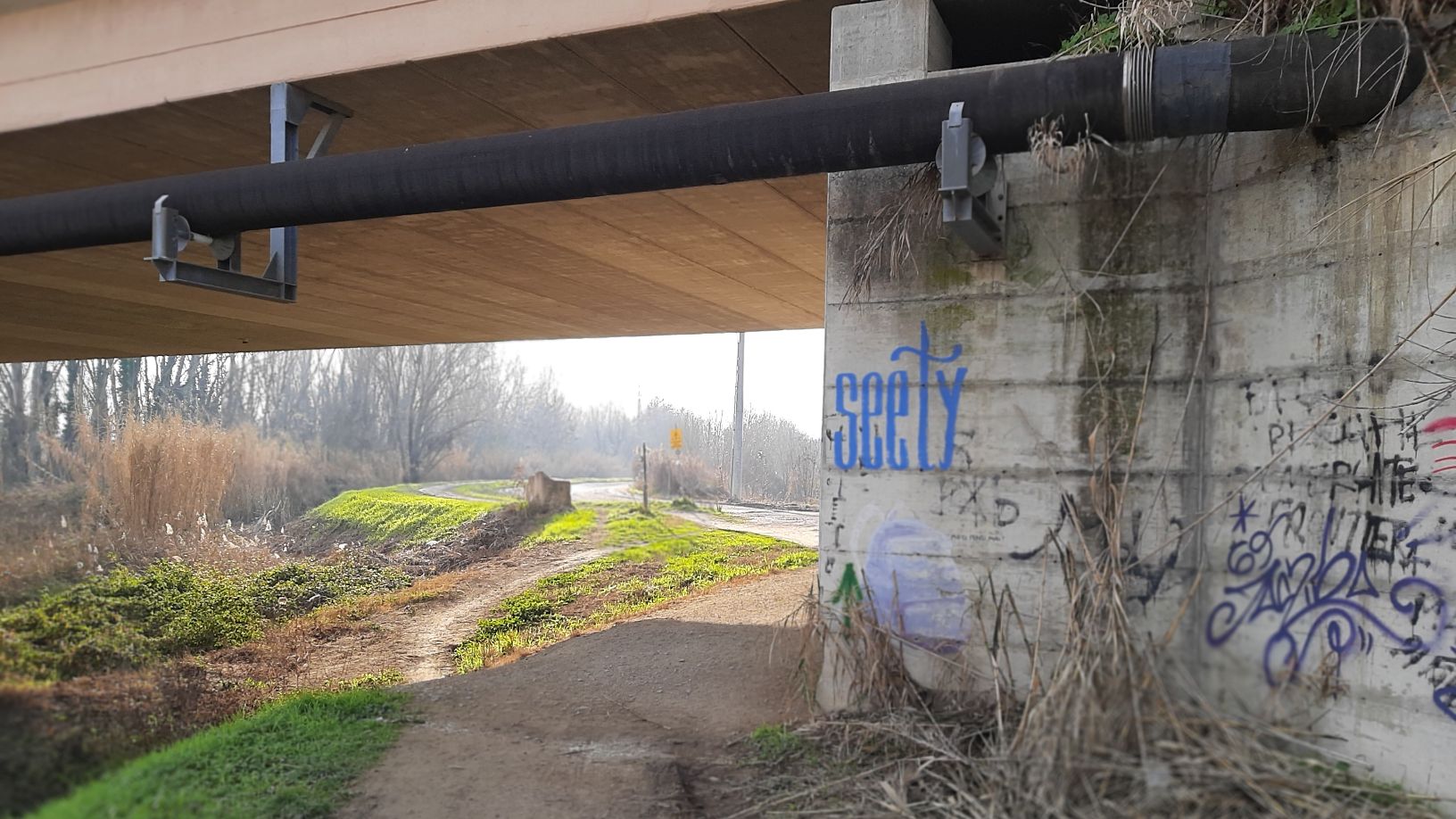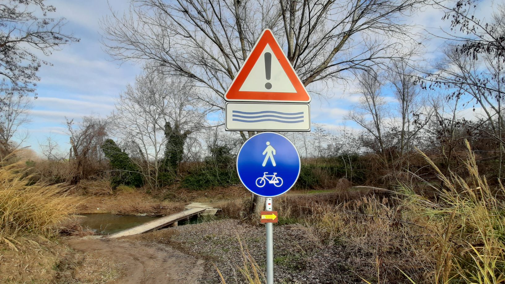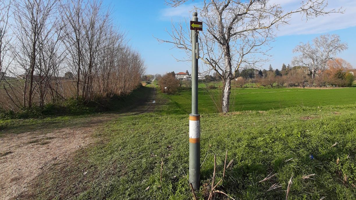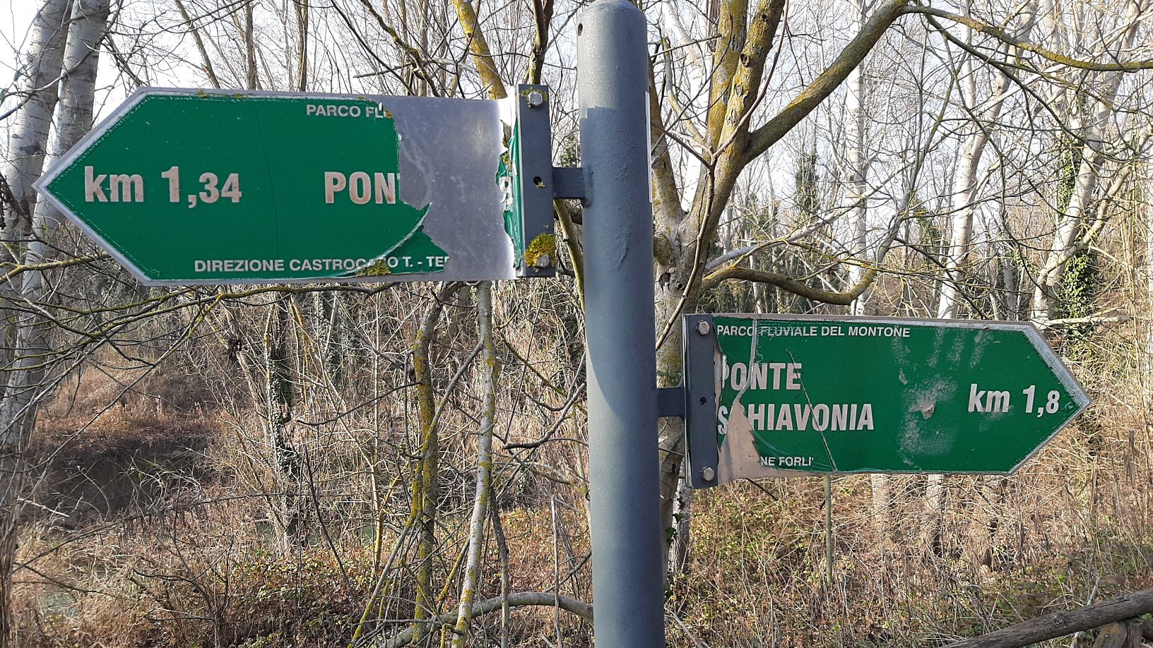 Passate sotto il ponte e girate a sinistra seguendo sempre la direzione "Cammino di Sant'Antonio" vi troverte a camminare sull' argine del fiume montone, con l'acqua alla votra sinitra fino ad arrivare ad una strada asfaltata